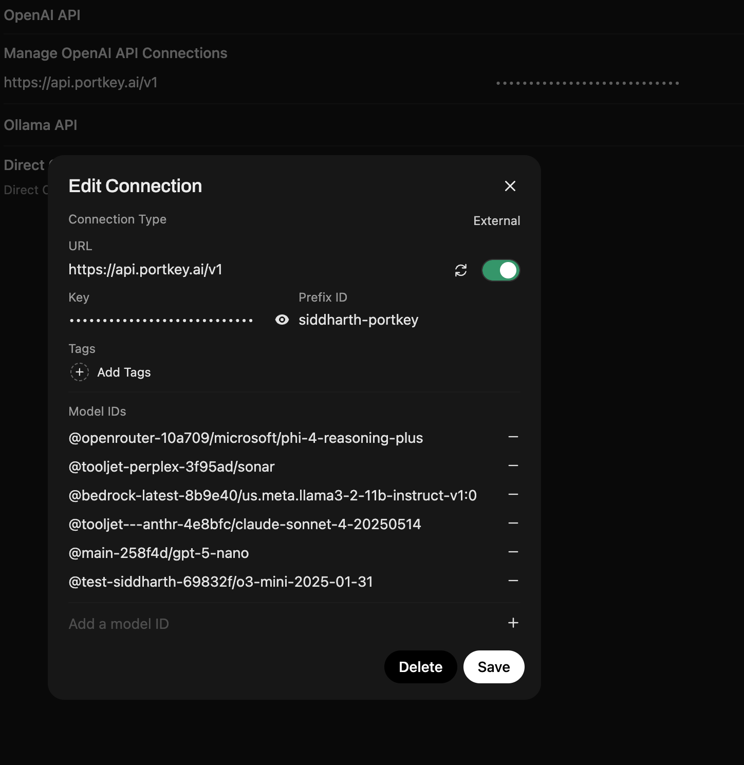 @openai-test/gpt-4o — use this in the model field of API requests.2. Connect Open WebUI to Portkey