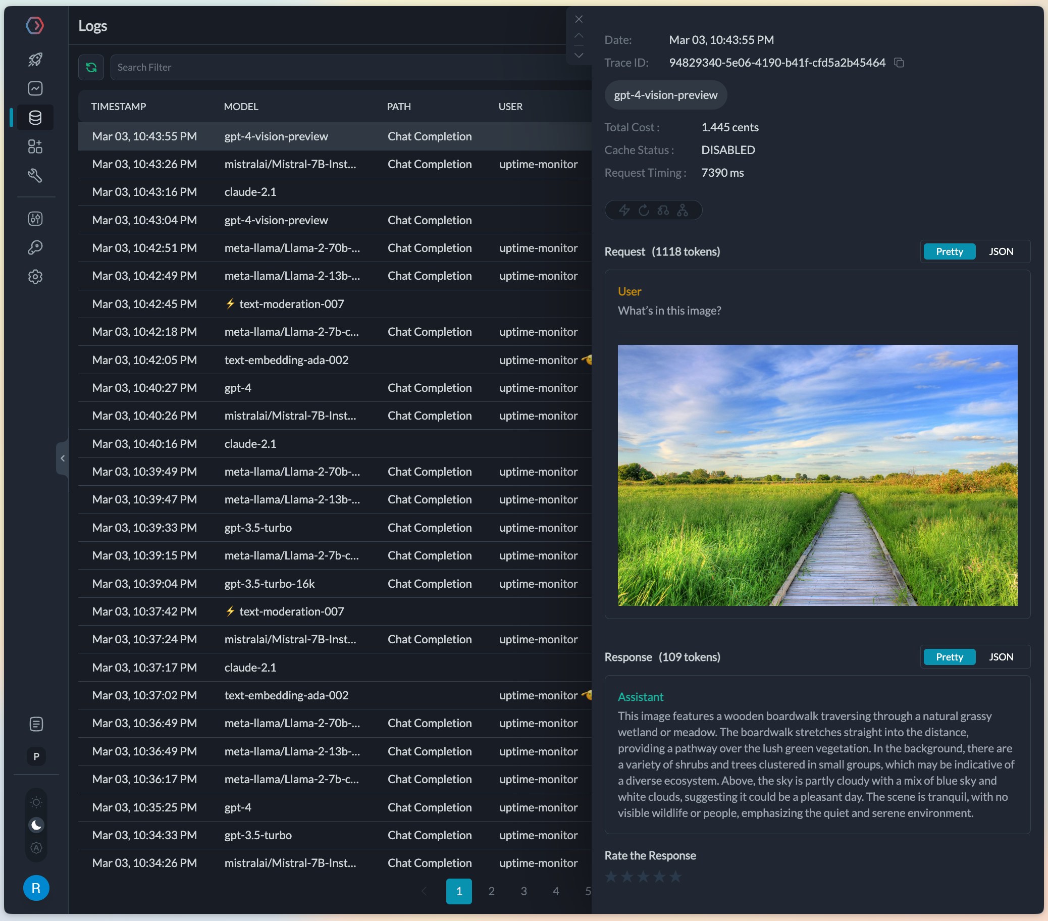 On completion, the request will get logged in the logs UI where any image inputs or outputs can be viewed. Portkey will automatically load the image URLs or the base64 images making for a great debugging experience with vision models.